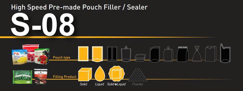 S-08 nổi bật với khả năng đóng gói đa dạng sản phẩm từ dạng lỏng, rắn, bột đến hỗn hợp, phù hợp cho nhiều ngành như thực phẩm, nông sản, thủy sản và công nghiệp chế biến.